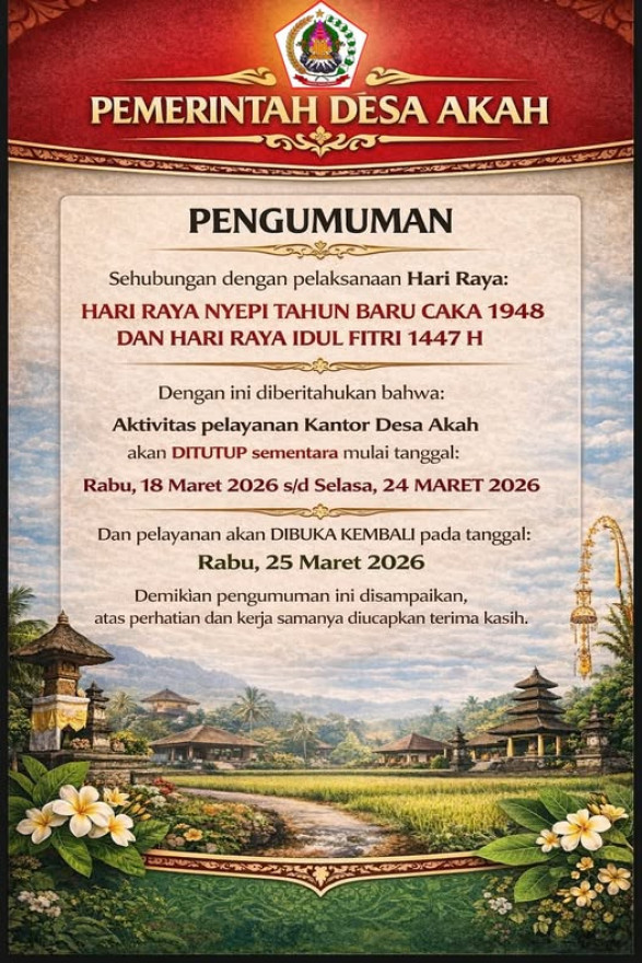 Pemerintah Desa Akah mengucapkan Selamat Hari Pramuka 14 Agustus 2021. Peringatan Hari Pramuka 2021 mengusung semangat “Berbakti Tanpa Henti," yang bermakna bahwa seluruh anggota Gerakan Pramuka selalu siap sedia untuk berbakti sampai kapan pun.